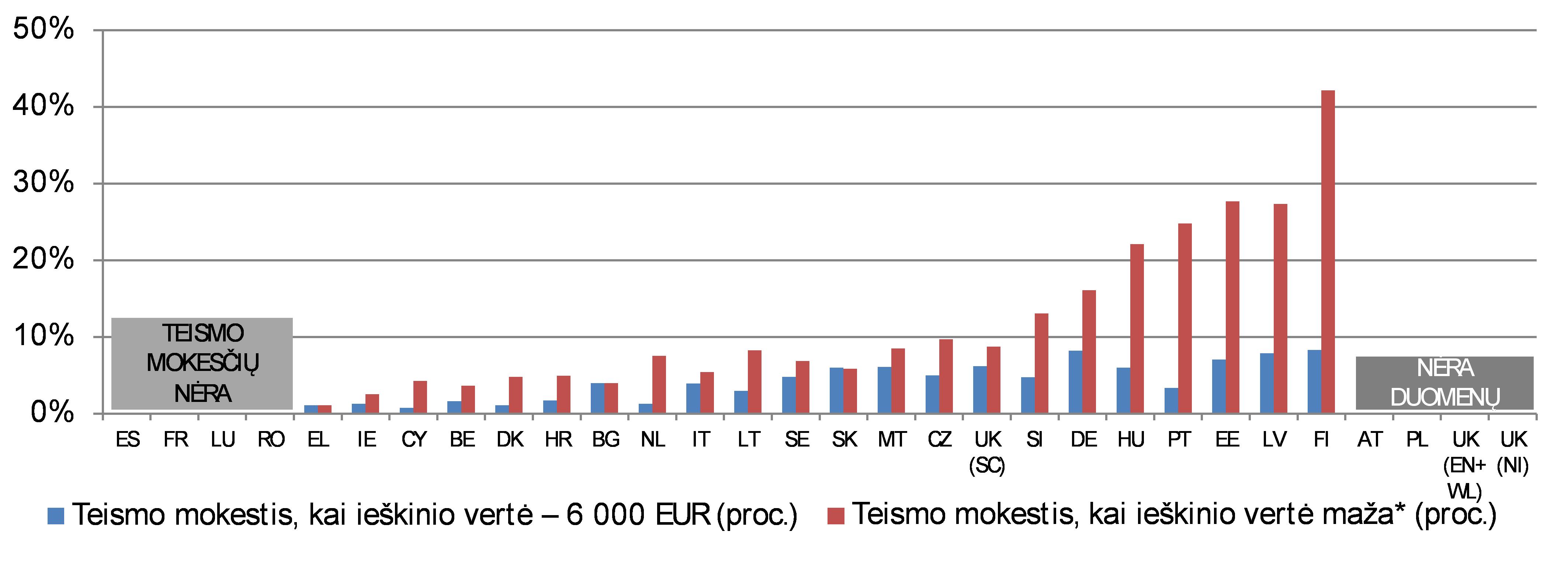 Galimybės pasinaudoti teisine pagalba ir teismo mokesčių lygis daro esminį poveikį galimybei pasinaudoti teise kreiptis į teismą, ypač skurdžiai gyvenančių piliečių. Šioje rezultatų suvestinėje nagrinėjama, kokiu mastu teisinės pagalbos sistemose remiami vartotojai, kurių ginčo su įmone vertė yra didelė (t. y. 6 000 EUR) arba maža (t. y. suma, dėl kurios pareikštas ieškinys, atitinka Eurostato nustatytą skurdo ribą). Iš 21 diagramos matyti, kad kai kuriose valstybėse narėse vartotojai, kurių pajamos yra mažesnės negu Eurostato nustatyta skurdo riba, negautų teisinės pagalbos. Sunkumai, patiriami siekiant pasinaudoti teisine pagalba, galėtų būti ypač atgrasantys tais atvejais, kai teismo mokesčiai sudaro didelę ieškinio sumos dalį (22 diagrama).