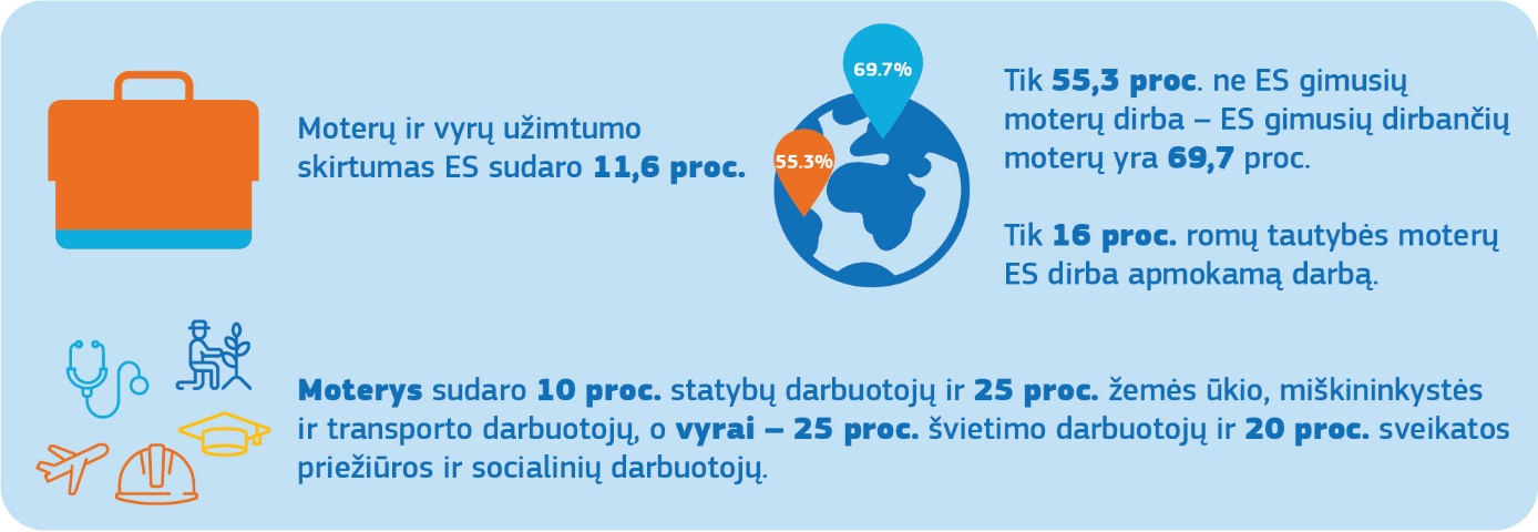Eurostatas, 2019 m., https://ec.europa.eu/eurostat/web/products-datasets/product?code=sdg_05_30 ir https://appsso.eurostat.ec.europa.eu/nui/show.do?dataset=lfsi_emp_a&lang=en , žr. infografiką.