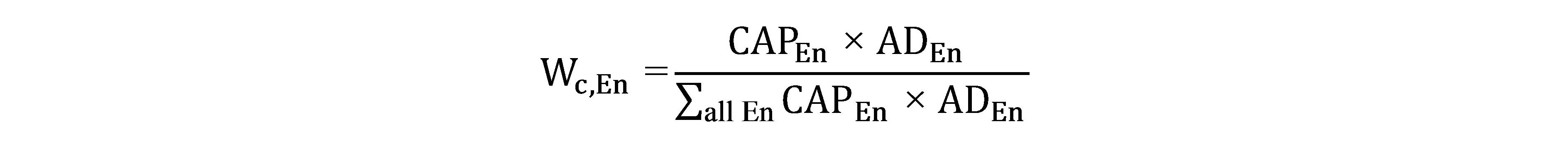 (a)Pārvades pakalpojumu jaudas ieņēmumus, kas gūstami no tīkla iekšsistēmiskā izmantojuma gan visos ieejas punktos, gan visos izejas punktos, dala ar attiecīgo jaudas izmaksu faktoru vērtību attiecībā uz tīkla iekšsistēmisko izmantojumu; tādā veidā aprēķina iekšsistēmisko jaudas rādītāju, kuru izsaka kā naudas vienību uz mērvienību, piemēram, euro uz MWh/dienā, pēc šādas formulas: