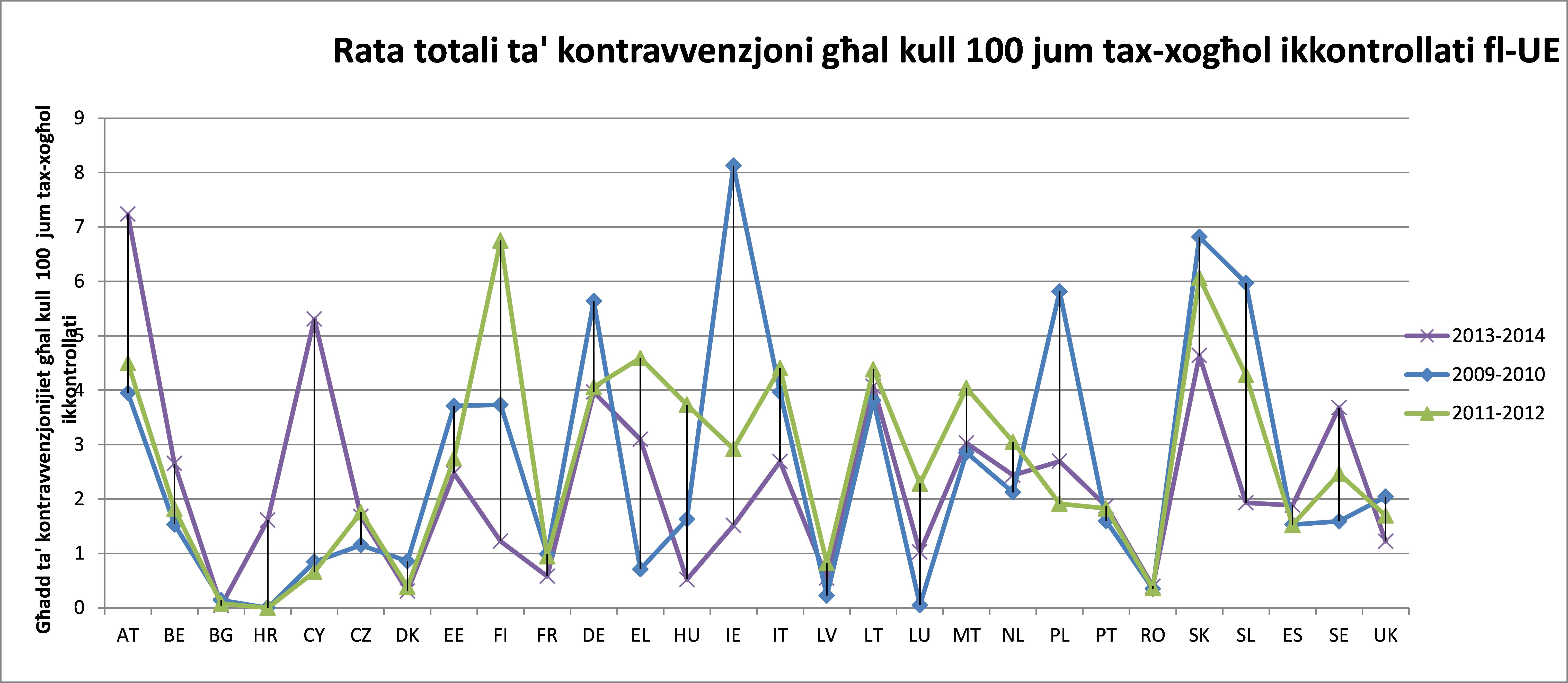 Grafika 4 - Għadd ta’ kontravvenzjonijiet identifikati għal kull 100 jum tax-xogħol li sarulhom kontrolli fl-2009-2010, l-2011-2012 u l-2013-2014
