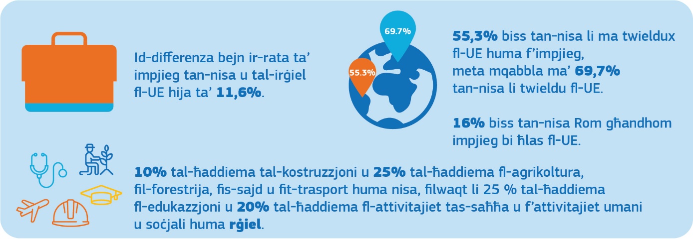 Ir-rata tal-impjiegi tan-nisa fl-UE llum hija ogħla minn qatt qabel , iżda ħafna nisa għadhom jesperjenzaw ostakli biex jidħlu u jibqgħu fis-suq tax-xogħol. Xi nisa huma strutturalment sottorappreżentati fis-suq tax-xogħol, li ta’ spiss jirriżulta mill-intersezzjoni tal-ġeneru b’kundizzjonijiet addizzjonali ta’ vulnerabbiltà jew emarġinazzjoni bħal appartenenza għal minorità etnika jew reliġjuża jew jekk ikollhom sfond ta’ migranti.