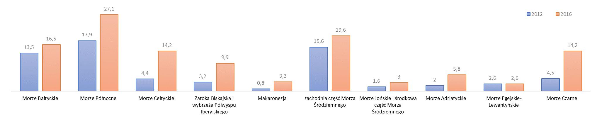 Rys. 2: Ostatnia zmiana (2012–2016) odsetka obszaru stanowiącego chronione obszary morskie na wodach UE w poszczególnych podregionach morskich.