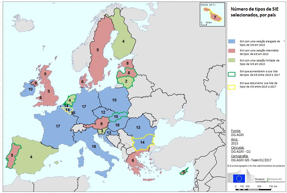 A partir de 2015, nove EstadosMembros alteraram as suas decisões, principalmente quanto à seleção de tipos de SIE (figura 1). Entre estes, seis alargaram as escolhas dos respetivos agricultores a outros tipos de SIE, aparentemente, após o estabelecimento do sistema administrativo necessário para controlar a sua aplicação. Os três restantes EstadosMembros retiraram alguns tipos de SIE, devido a um grau de implantação muito baixo por parte dos agricultores.