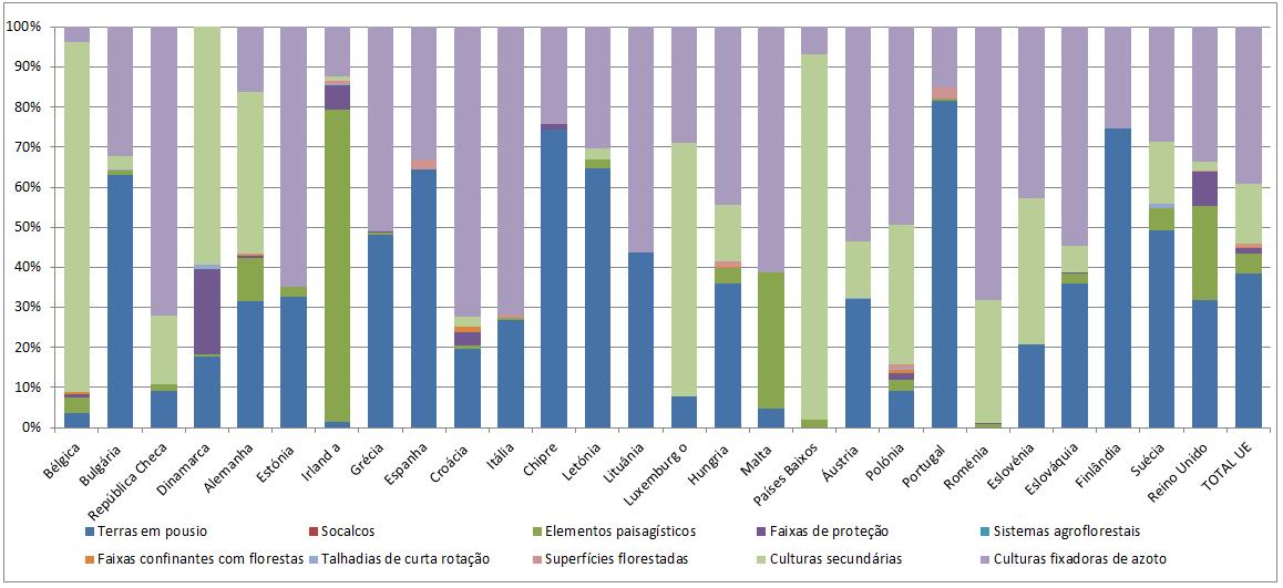 14 EstadosMembros disponibilizaram uma lista extensa de tipos de SIE (entre 10 e 19). Todos eles selecionaram as terras em pousio, talhadias de curta rotação, culturas fixadoras de azoto, faixas de proteção (com exceção da República Checa), culturas secundárias/coberto vegetal (com exceção de Itália) e pelo menos quatro entre nove tipos diferentes de elementos paisagísticos (principalmente árvores em grupo e árvores em linha),
