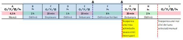 VU calculează timpul de conducere zilnic pentru schimburile RTM în curs și anterioare. Timpul de conducere care apare în timpul întreruperilor perioadelor de odihnă zilnice nu se adaugă la calculul timpului de conducere zilnic, atunci când astfel de întreruperi sunt cauzate de un traseu parcurs pe feribot/în tren, iar cerințele prevăzute la literele (h) și (j) de la punctul 2 și cele de la punctul 3 au fost îndeplinite. Cu toate acestea, atât timp cât VU nu a calculat o perioadă completă de odihnă zilnică normală sau divizată în conformitate cu punctul 3, timpul de conducere care are loc pe parcursul întreruperilor se adaugă la timpul de conducere zilnic pentru schimbul RTM în curs.
