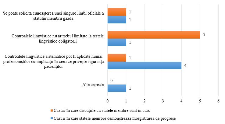 Măsura de aplicare a legii adoptată de Comisie a vizat să asigure, de exemplu, că se poate solicita cunoașterea unei singure limbi oficiale a statului membru și că controalele lingvistice sistematice pot fi aplicate numai profesioniștilor cu implicații în ceea ce privește siguranța pacienților. Mai multe cazuri în care statele membre au impus teste lingvistice obligatorii s-au dovedit a fi cel mai dificil de soluționat, iar discuțiile cu majoritatea statelor membre vizate sunt în curs. Pe baza jurisprudenței consacrate a Curții de Justiție, Comisia a insistat că testele lingvistice puteau fi susținute numai în cazurile în care dovezile furnizate de solicitant (de exemplu, certificate lingvistice eliberate de o școală de limbi străine) nu erau concludente.