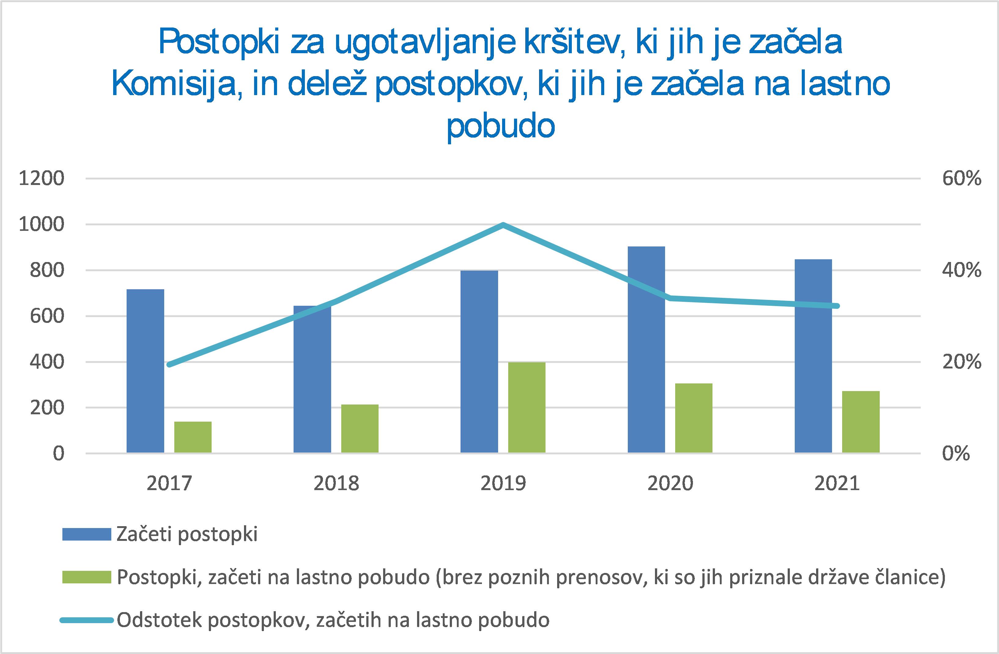 Komisija začne postopke za ugotavljanje kršitev na lastno pobudo, kot ukrepanje na podlagi pritožbe ali samodejno vsaka dva meseca, in sicer so to zadeve zaradi nesporočanja, ki se sprožijo s priznanjem držav članic, da direktiv EU do roka niso v celoti prenesle. Primere poznega prenosa direktiv v nacionalno zakonodajo Komisija še naprej obravnava prednostno, saj te zamude preprečujejo, da bi se uresničile koristi dogovorjenih pravil EU. Sčasoma se je število primerov, kjer države članice zamudijo rok za prenos direktiv, zmanjšalo, zato se je na splošno zmanjšalo tudi število postopkov za ugotavljanje kršitev 87 .