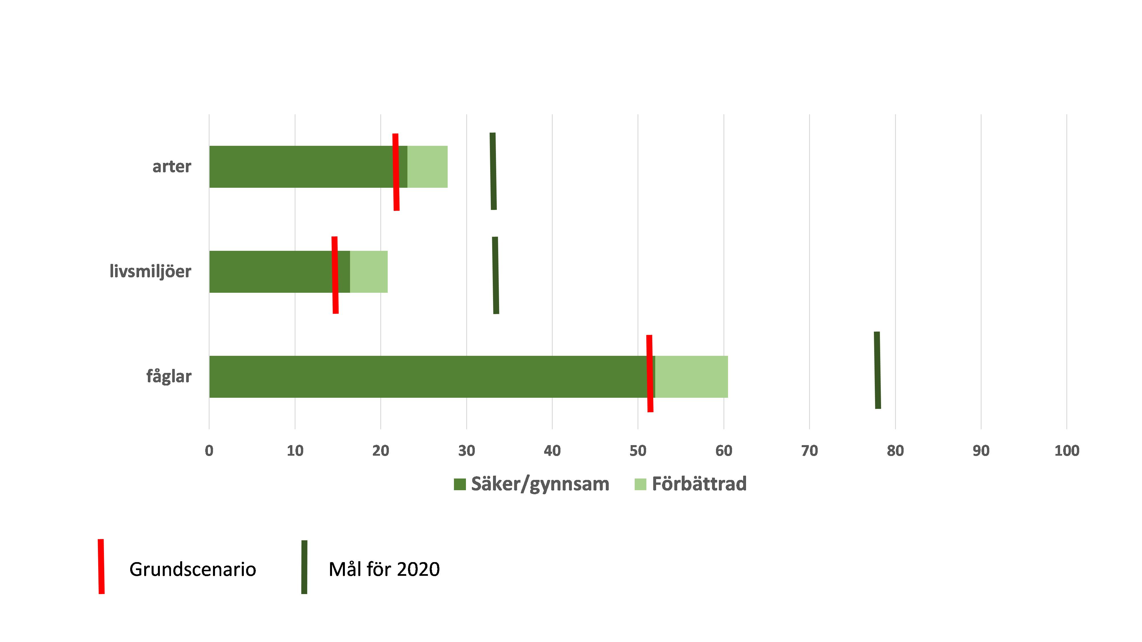 2.1.Mål 1: Hejda försämringen av statusen för alla arter och livsmiljöer som omfattas av EU:s naturvårdslagstiftning och uppnå en betydande och mätbar förbättring av deras status, så att till 2020 jämfört med nuvarande bedömningar i) 100 % fler livsmiljöbedömningar och 50 % fler artbedömningar enligt habitatdirektivet visar en bättre bevarandestatus, och ii) 50 % fler artbedömningar enligt fågeldirektivet visar en säker eller förbättrad status.