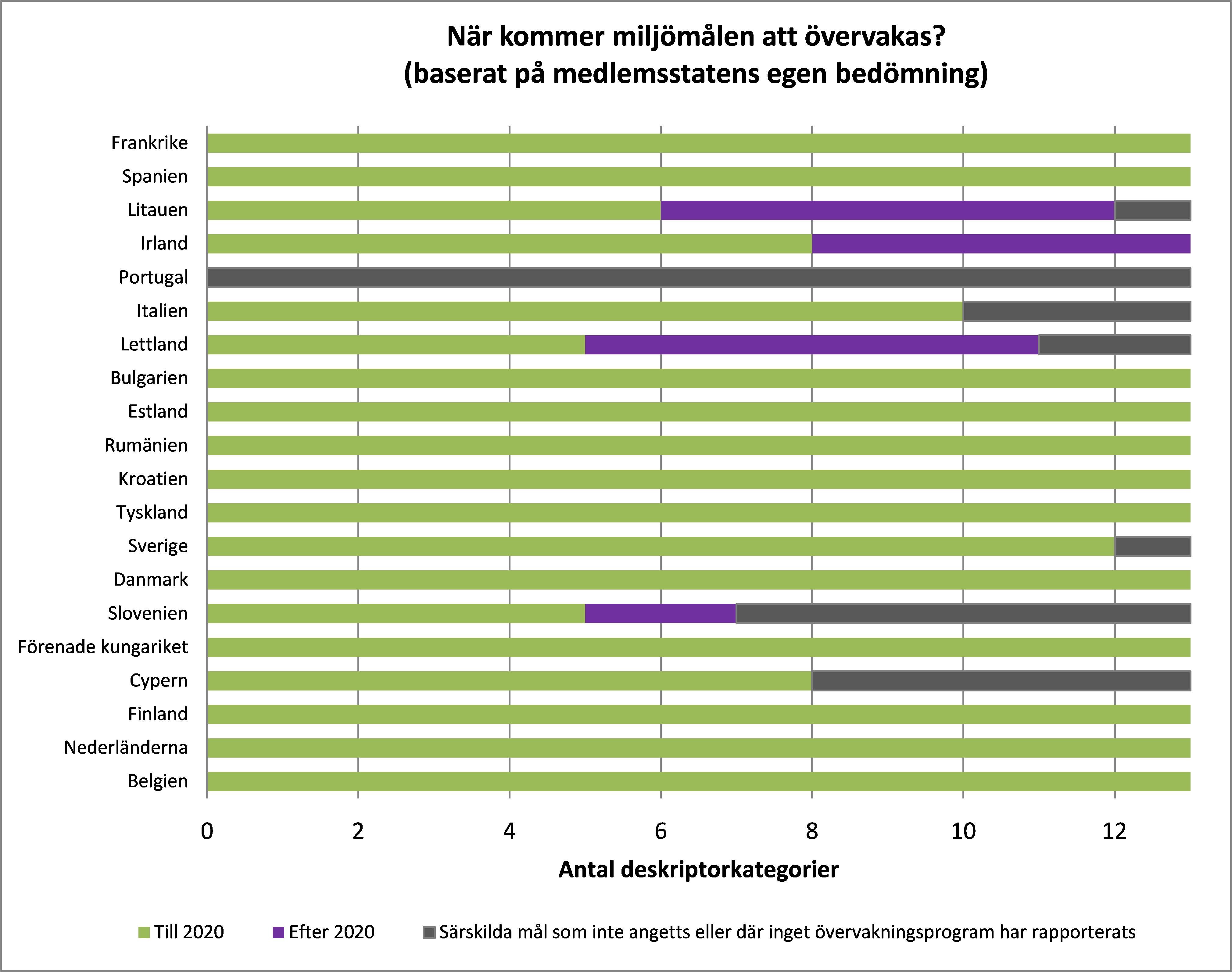 Medlemsstaterna skulle ha utformat och genomfört sina övervakningsprogram senast den 15 juli 2014. Bild 3 visar andelen övervakningsprogram per deskriptorkategori som förväntas genomföras till 2014, 2018, 2020 och efter 2020. Under 2014 var de deskriptorer som övervakades mest av medlemsstaterna främmande ämnen i fisk och skaldjur (deskriptor 9), kommersiellt nyttjade fiskar och skaldjur (deskriptor 3) och eutrofiering (deskriptor 5). Mot bakgrund av medlemsstaternas självbedömningar kommer övervakningsprogram för eutrofiering (deskriptor 5), däggdjur, kräldjur, fiskar och bläckfiskar (deskriptorerna 1 och 4) och främmande ämnen (deskriptor 8) att genomföras till 2020. För kommersiellt nyttjade fiskar och skaldjur (deskriptor 3), hydrografiska förändringar (deskriptor 7), marint avfall (deskriptor 10) samt förekomst av arter på havsbottnen och i vattenpelaren (deskriptorerna 1, 4 och 6) beräknas nära 90 % av övervakningsprogrammen att vara genomförda till 2020.